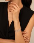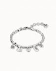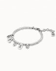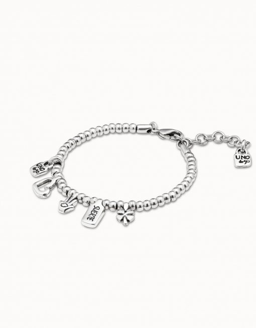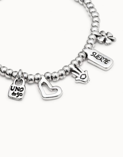 Inpirada en la búsqueda de la buena fortuna, esta original pulsera está bañada en plata y consta de múltiples piezas perladas acompañadas de cuatro charms en forma de corazón, trébol, candado y mano. La joya, de carácter multisimbólico, está elaborada siguiendo un proceso 100 % artesanal, en España, por UNOde50.
