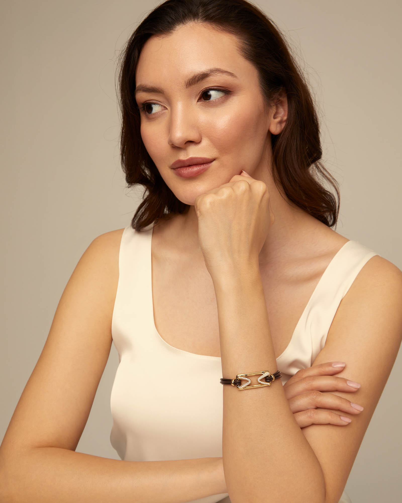 PULSERA DE ORO Y CUERO CON ESLABON CENTRAL CON TOPACIOS BRAVE. Piezas de geometría orgánica que hablan de valentía le dan vida a la colección Brave con esta pulsera de cuero con un eslabón central en forma rectangular con pequeños y elegantes topacios. Cierre de mosquetón y cadena extensible con el icónico candado de UNOde50. Creatividad, generosidad y abundancia. Joya Made in Spain, elaborada 100% artesanalmente, consiguiendo así un acabado de diseño único.