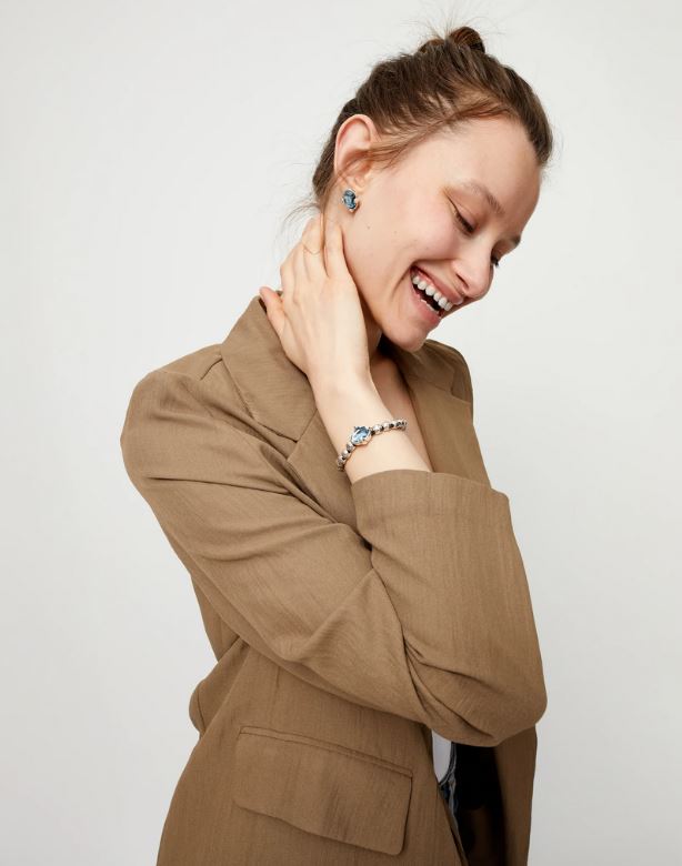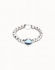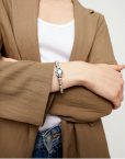 La pulsera representa la unión perfecta entre lo robusto y lo sutil, donde la frialdad del metal enmarca la vivacidad del cristal.