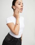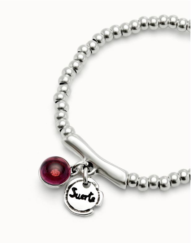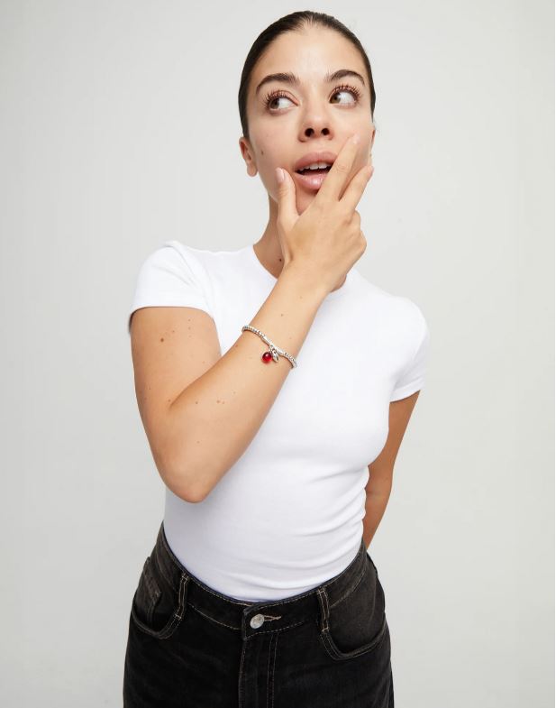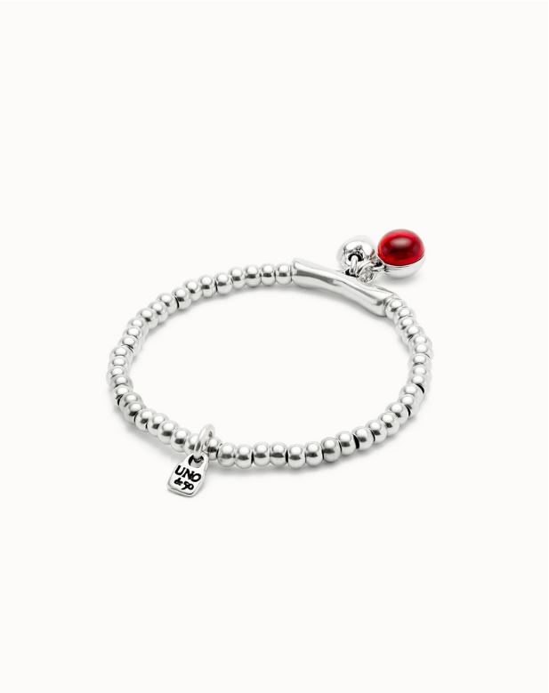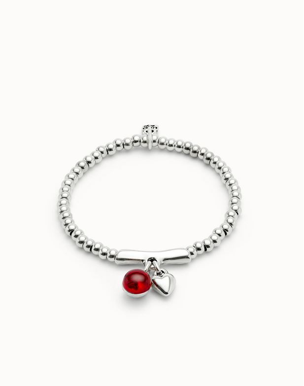 Esta pulsera elástica bañada en plata combina cuentas redondeadas con una barra central de la que cuelgan dos charms: un corazón metálico y una gota de cristal de Murano rojo intenso. Una joya que habla de amor propio, pasión y autenticidad.