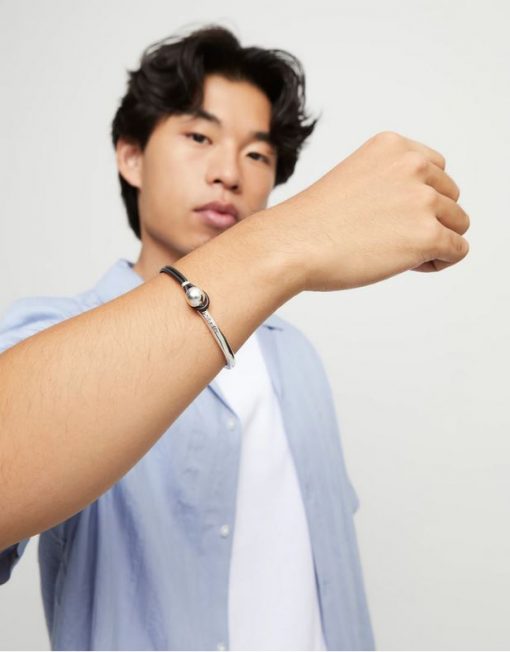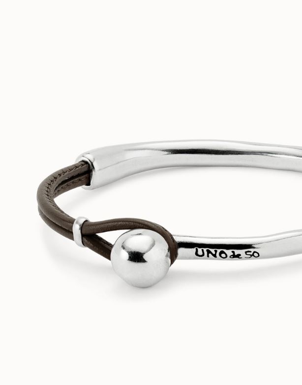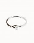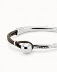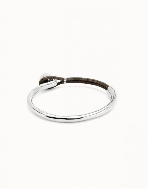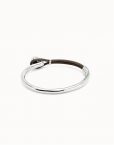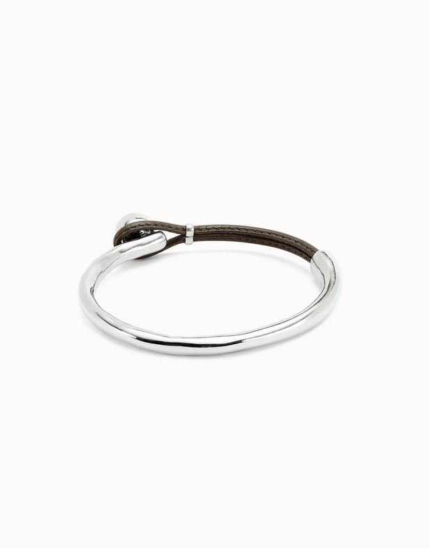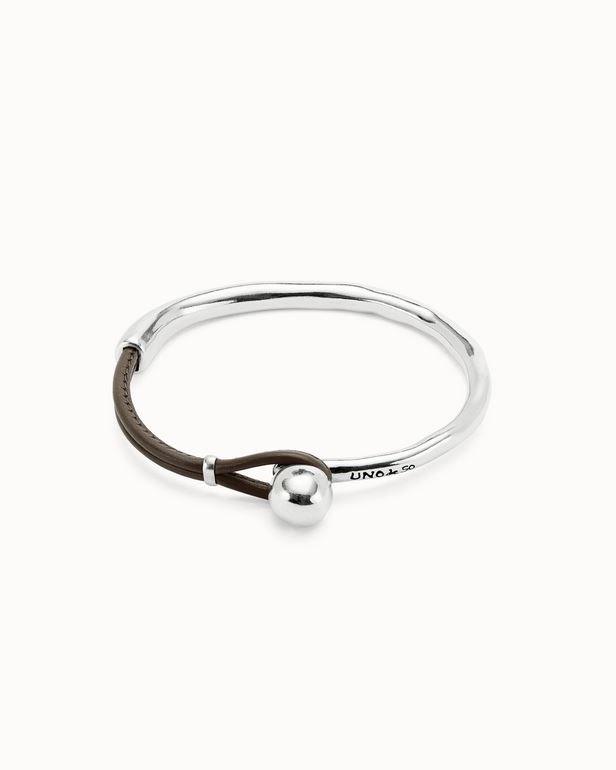 Esta pulsera rígida bañada en plata combina el acabado pulido y la estructura firme con un toque inesperado: un cordón de cuero marrón que sujeta una bola central, aportando contraste, textura y movimiento.