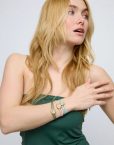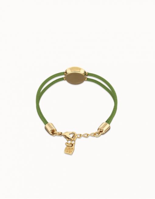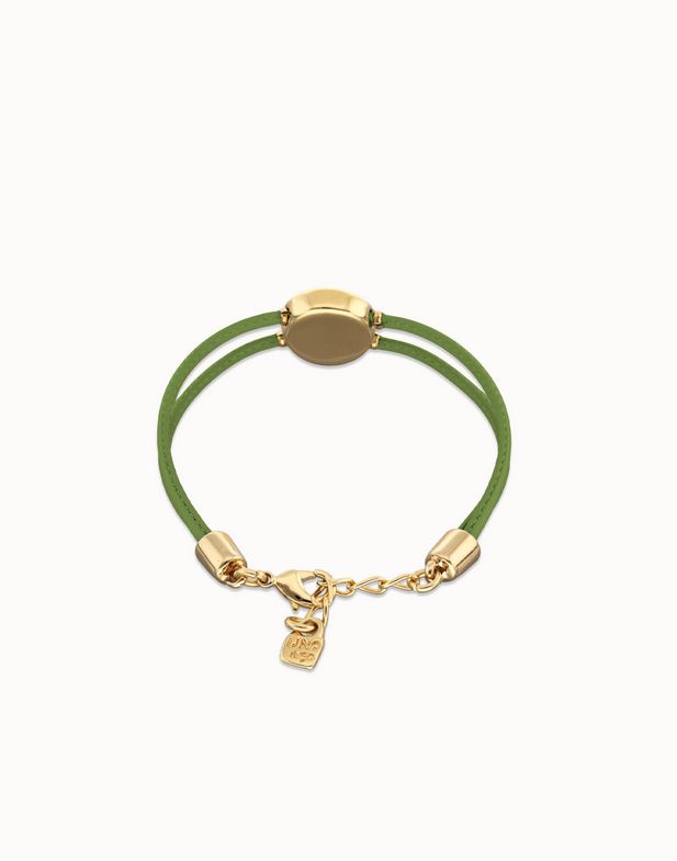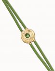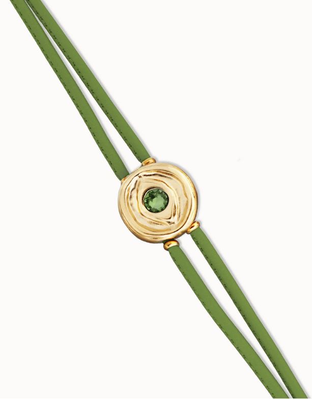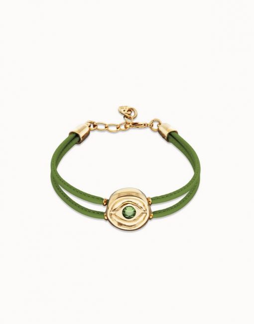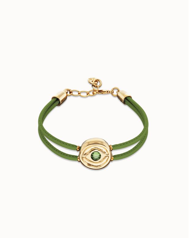 Pulsera ajustable de doble tira de cuero italiano en color verde esmeralda, símbolo de renovación, serenidad y conexión con la naturaleza. En el centro, una pieza bañada en oro con forma de ojo sostiene un cristal verde facetado, piedra vinculada al mes de septiembre, que representa equilibrio, sensibilidad y sabiduría interior.