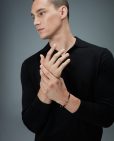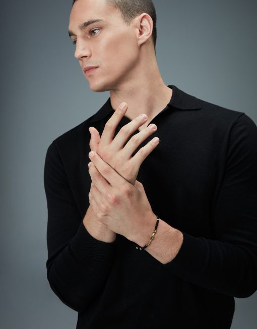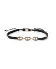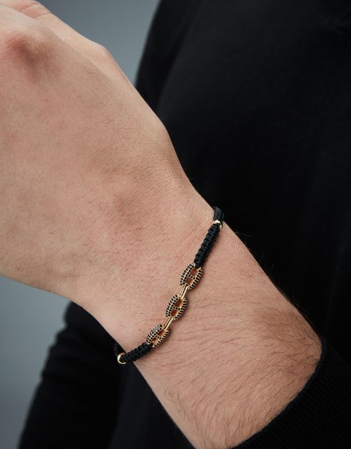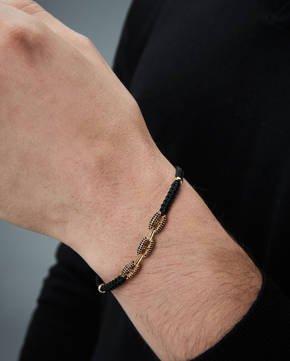 Una pulsera que combina lujo y modernidad con un diseño sofisticado. Fabricada en plata de primera ley con un baño de oro, esta pieza presenta un cordón negro que aporta un contraste elegante y contemporáneo. Los eslabones, adornados con circonitas negras, ofrecen un toque de brillo sutil que complementa perfectamente el diseño. Con un largo ajustable de 18 a 26 cm, se adapta cómodamente a la muñeca, brindando un fit perfecto y versatilidad. Ideal para hombres que buscan un accesorio refinado, dinámico y lleno de estilo, perfecto para cualquier ocasión.
