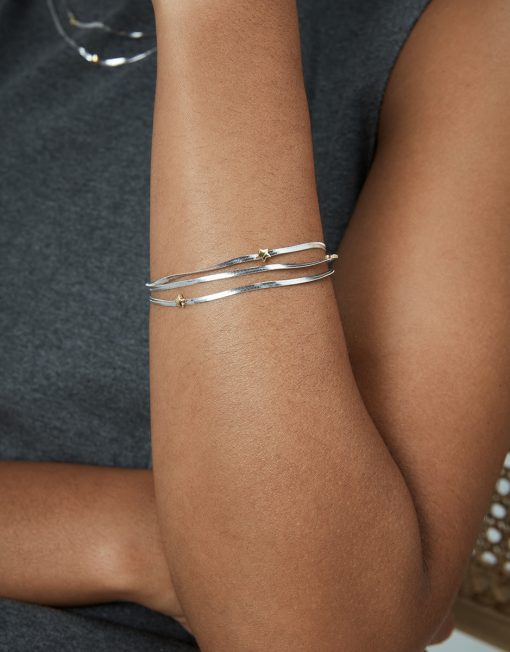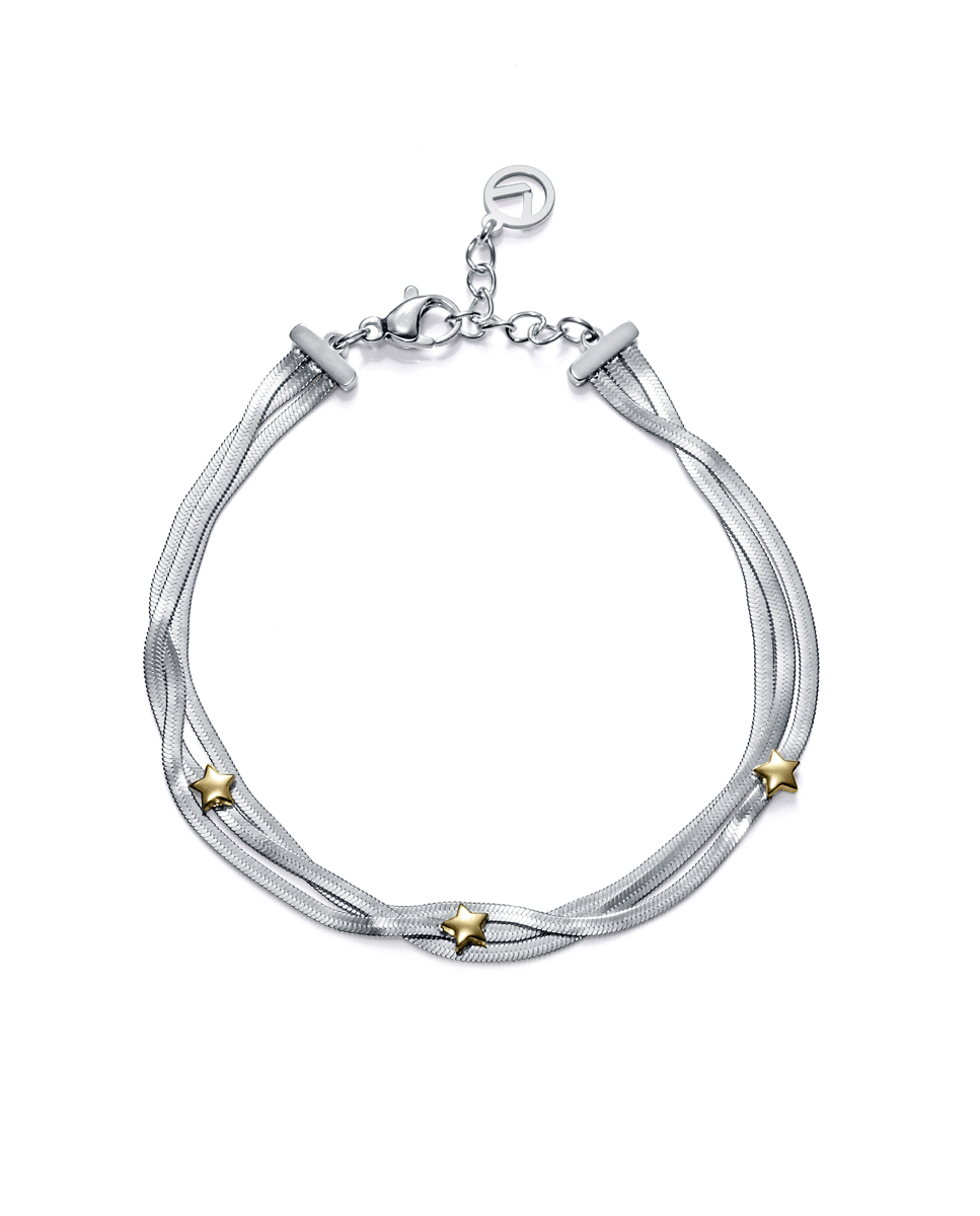 Una pulsera que captura la esencia de la elegancia contemporánea con un toque de magia. Fabricada en acero con una cadena de serpiente plana múltiple, presenta un acabado IP dorado que le da un brillo cálido y sofisticado. Las estrellas que adornan el diseño aportan un toque de delicadeza y simbolizan sueños y aspiraciones. Con un largo de 17,5 cm más 2 cm de extensión, se ajusta cómodamente a la muñeca, convirtiéndola en un accesorio ideal para realzar cualquier look con un toque moderno y lleno de personalidad. Una joya pensada para mujeres que buscan sofisticación y estilo en cada detalle.