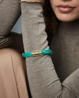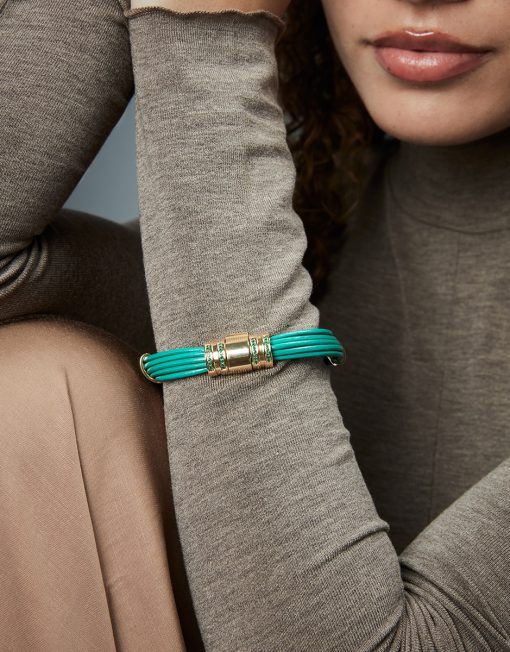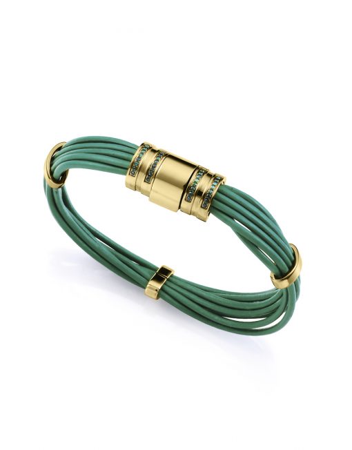 Una pulsera que combina frescura y sofisticación en un diseño único. Fabricada en acero con acabado IP dorado, esta pieza se realza con detalles de piel verde, aportando un toque de color vibrante y natural. Las circonitas verdes engastadas añaden un brillo delicado, complementando perfectamente el diseño con un toque de lujo. Con un largo de 20 cm, se ajusta cómodamente a la muñeca, convirtiéndola en una joya versátil y moderna. Ideal para mujeres que buscan un accesorio elegante y lleno de carácter, capaz de realzar cualquier look con distinción y frescura.
