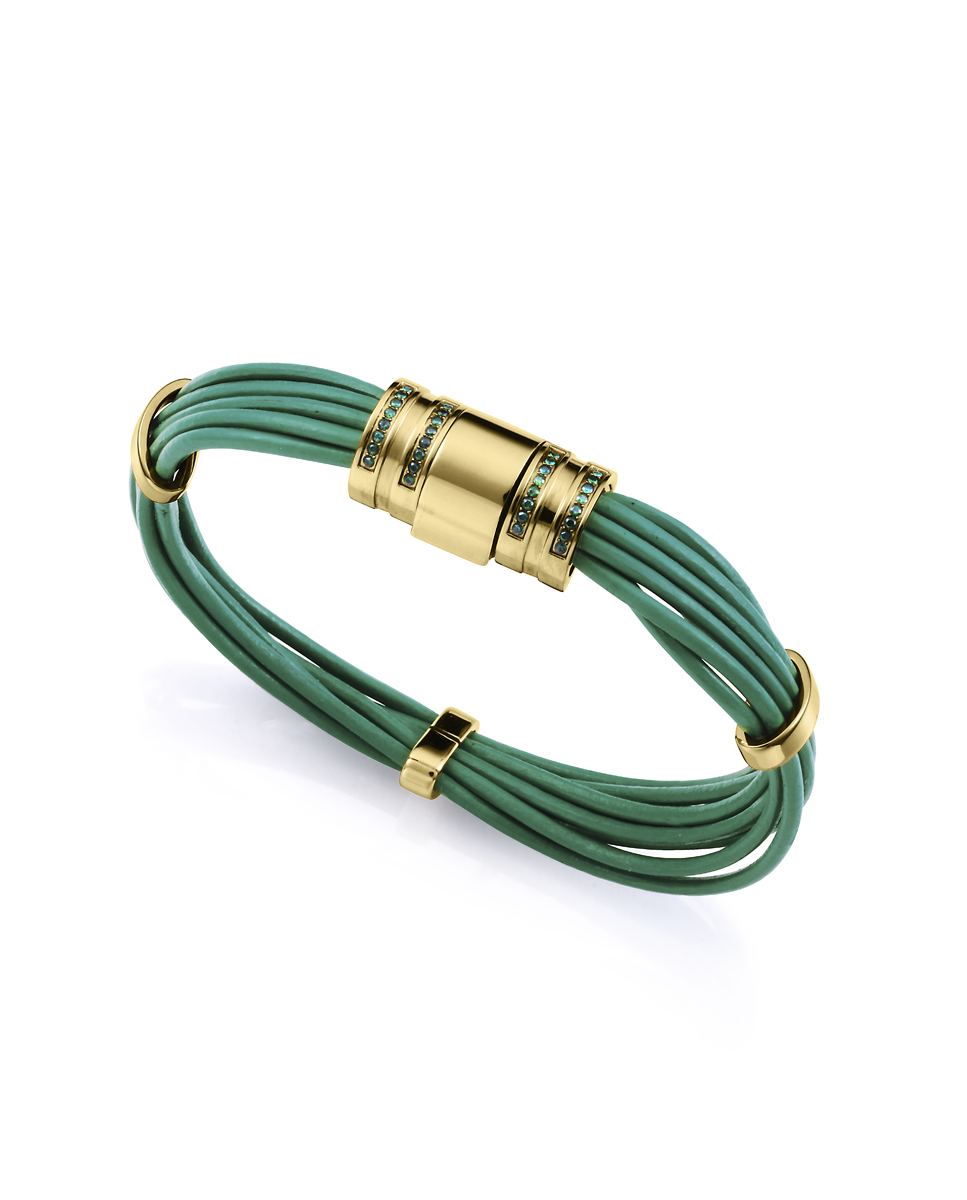 Una pulsera que combina frescura y sofisticación en un diseño único. Fabricada en acero con acabado IP dorado, esta pieza se realza con detalles de piel verde, aportando un toque de color vibrante y natural. Las circonitas verdes engastadas añaden un brillo delicado, complementando perfectamente el diseño con un toque de lujo. Con un largo de 20 cm, se ajusta cómodamente a la muñeca, convirtiéndola en una joya versátil y moderna. Ideal para mujeres que buscan un accesorio elegante y lleno de carácter, capaz de realzar cualquier look con distinción y frescura.