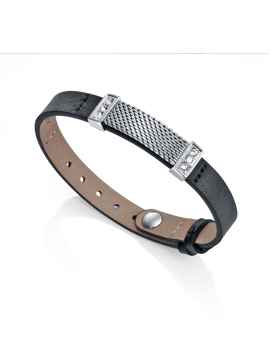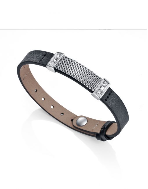Pulsera Viceroy Piel y Acero Mujer 21000P01010. Es una pulsera diseñada por la marca Viceroy de la colección Antonio Banderas. Es un modelo para mujer, fabricada en cuero de color negra con placa de malla milanesa en acero y 6 circonitas cúbicas transparentes. Cierre ajustable a la muñeca. Esta pulsera tiene un diámetro de 22.5 centímetros.
