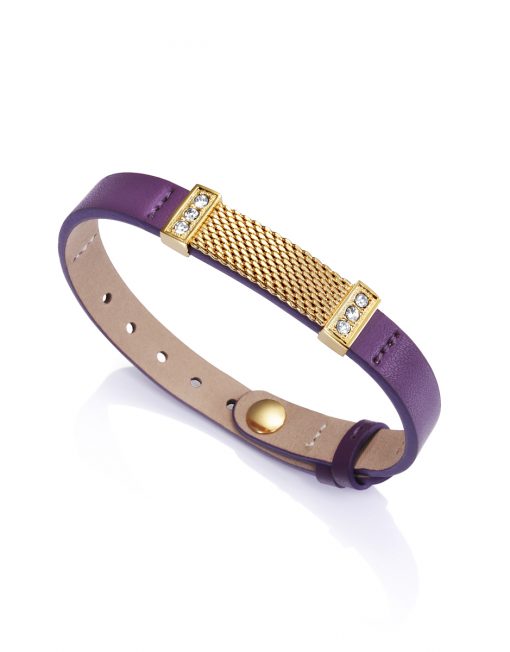 Pulsera Viceroy Piel y Acero Mujer 21000P01017. Es una pulsera diseñada por la marca Viceroy de la colección Antonio Banderas. Es un modelo para mujer, fabricada en cuero de color lila con placa de malla milanesa en acero con IP dorado y 6 circonitas cúbicas transparentes. Cierre ajustable a la muñeca. Esta pulsera tiene un diámetro de 22.5 centímetros.
