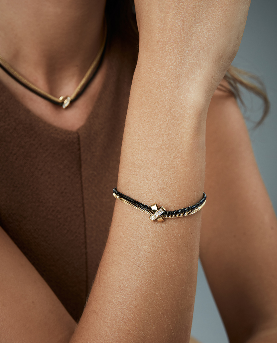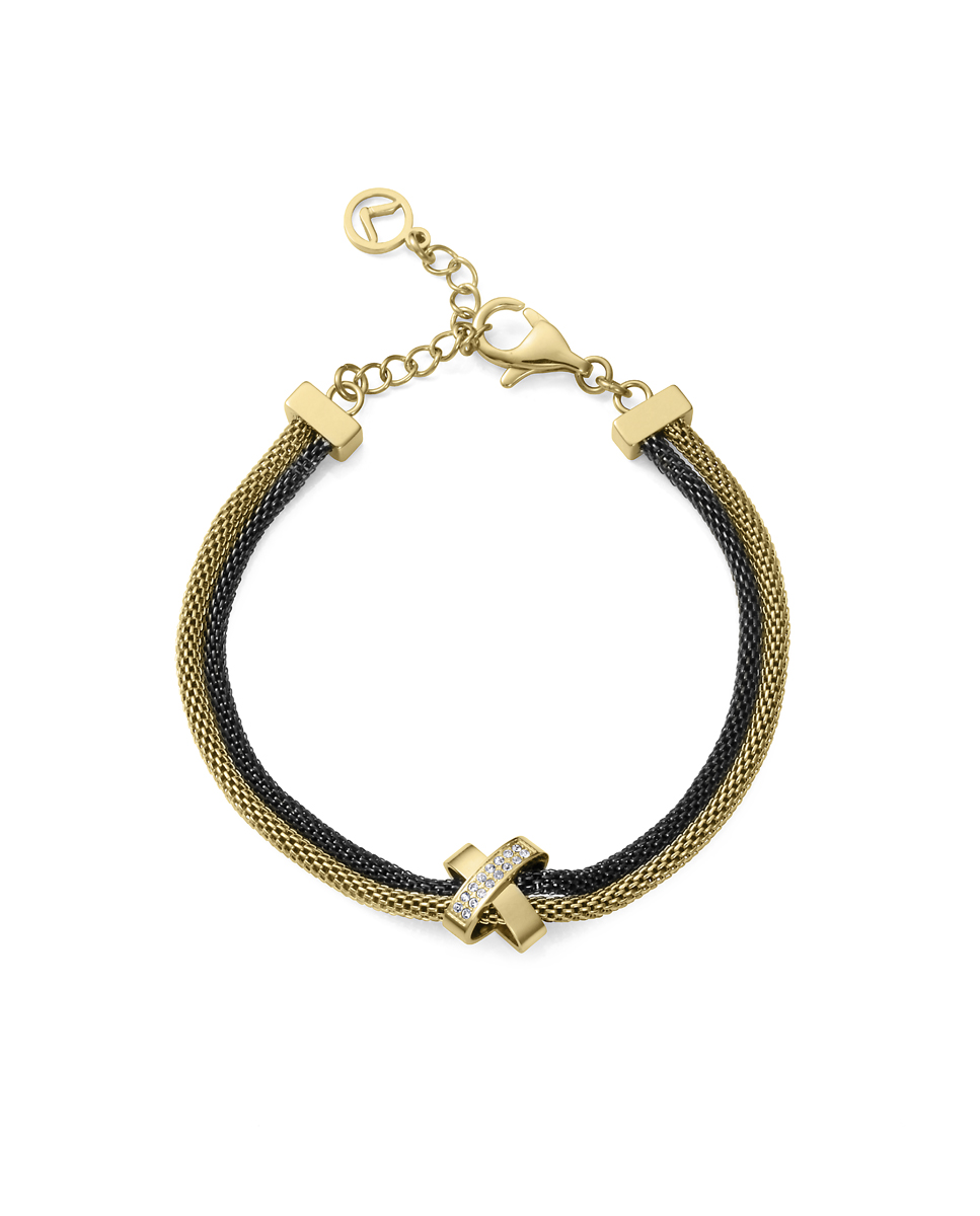 Una pulsera que combina modernidad y elegancia en un diseño único. Fabricada en acero con acabados IP dorado y negro, presenta un diseño de doble esterilla redonda con una X central adornada con circonitas que aportan un brillo sutil y sofisticado. El contraste entre el dorado, el negro y las circonitas crea una pieza armoniosa y llena de distinción. Con un largo de 17 cm más 3 cm de extensión, se ajusta cómodamente a la muñeca, convirtiéndola en una joya versátil y moderna, ideal para complementar cualquier look con un toque de sofisticación y estilo.
