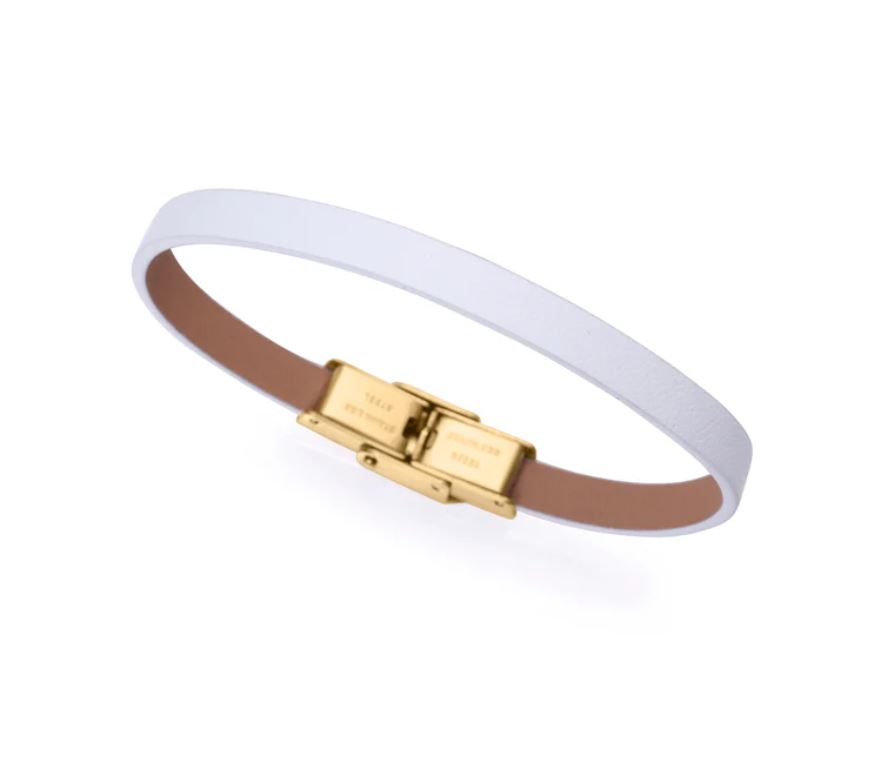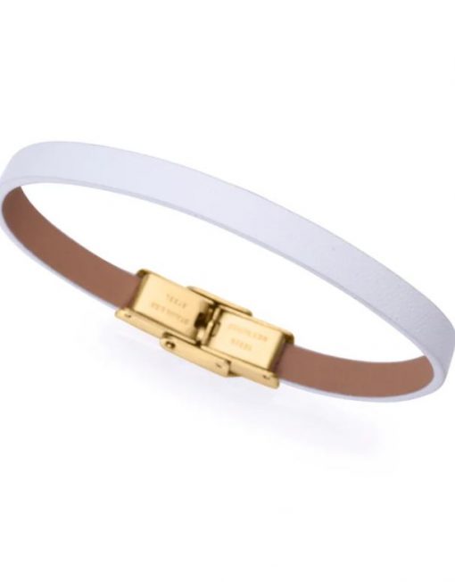 Esta encantadora pulsera de niña en acero IP dorado con detalles en piel blanca es el complemento perfecto para añadir un toque de elegancia y frescura a cualquier ocasión. Su diseño combina la calidez del dorado con la suavidad de la piel, creando una pieza delicada y moderna. Está diseñada para ajustarse cómodamente y destacar por su estilo único. Ideal para regalar o como un detalle especial, esta pulsera es una joya atemporal que refleja buen gusto y sencillez. Largo 18 cm