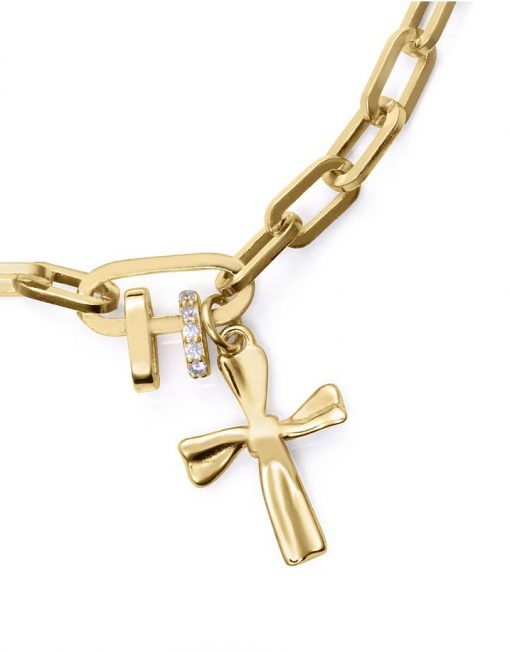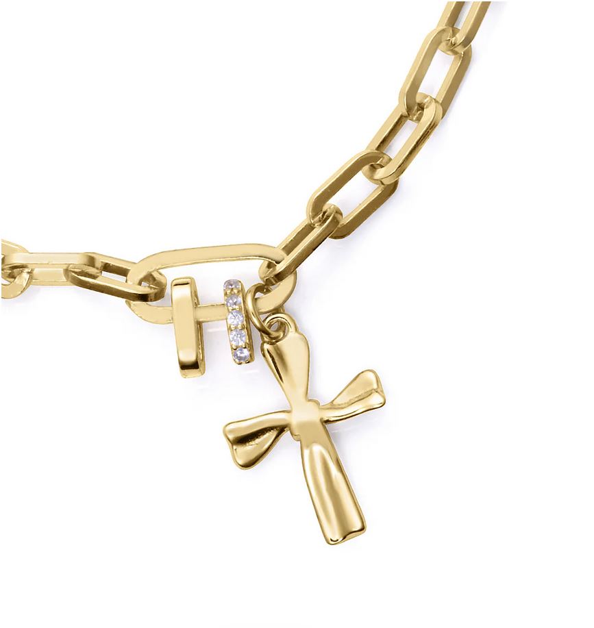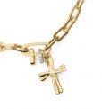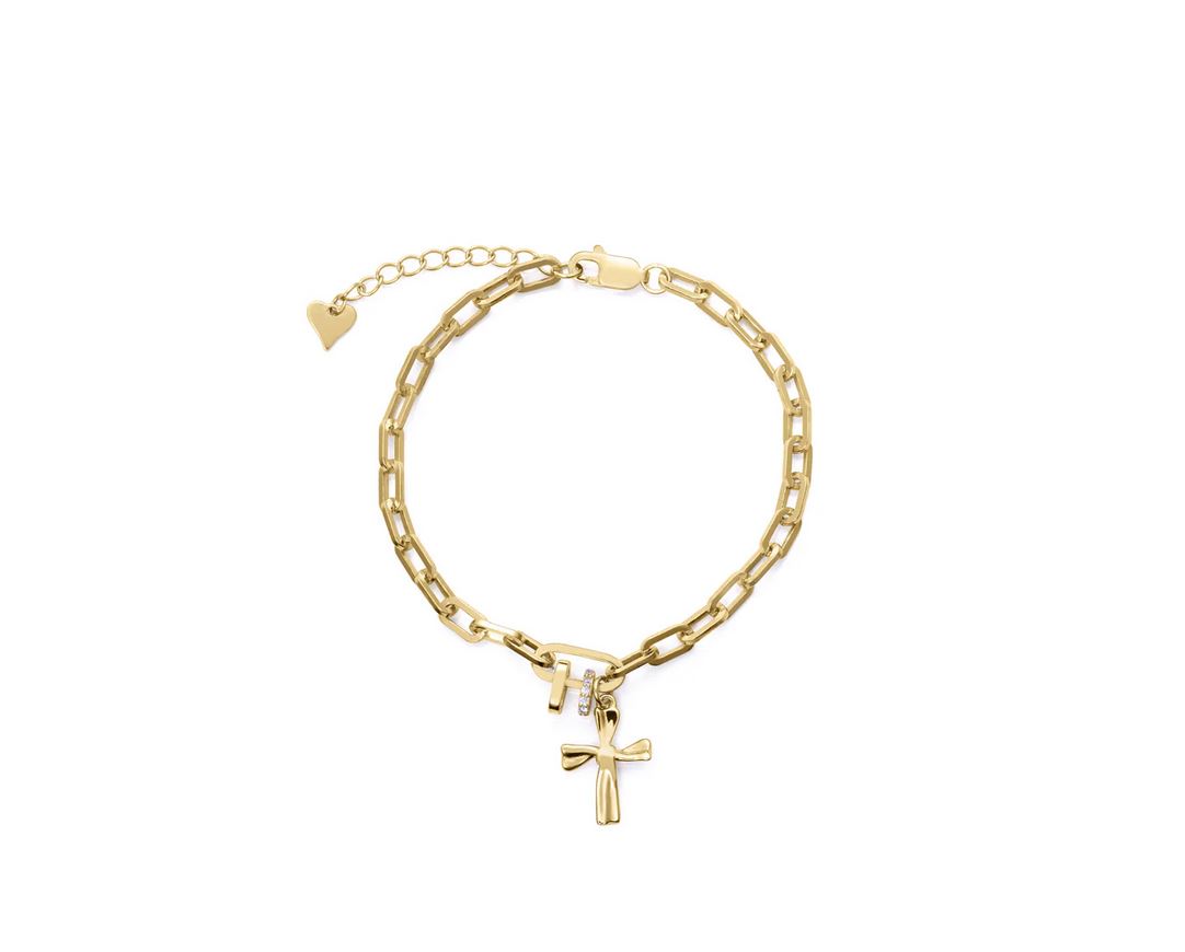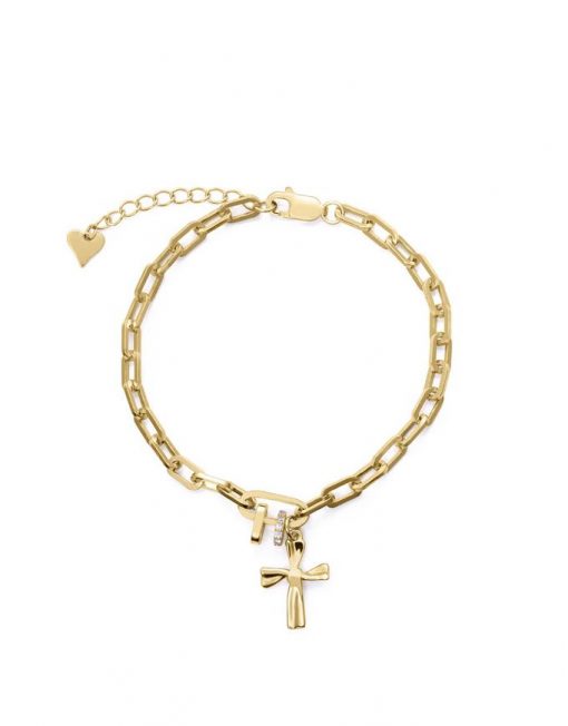 Esta delicada pulsera de niña en plata de primera ley con baño de oro es una joya que combina elegancia y dulzura en cada detalle. Decorada con brillantes circonitas blancas, aporta un toque de luminosidad que la hace perfecta para ocasiones especiales o para realzar cualquier look diario. La cruz colgante añade un simbolismo clásico y encantador, mientras que su largo asegura un ajuste cómodo y versátil. Ideal como regalo significativo o como un detalle especial. Largo 16 + 2 cm