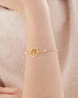 Pulsera con perla de Plata de Ley bañada en Oro de 18kt. Tamaño del motivo de 1,5cm en forma de árbol. vida. Tamaño del cristal 2mm. Largo de 16-19cm con cierre mosquetón y cadena rolo de la colección Sera