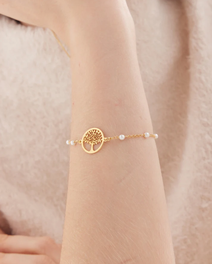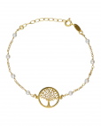 Pulsera con perla de Plata de Ley bañada en Oro de 18kt. Tamaño del motivo de 1,5cm en forma de árbol. vida. Tamaño del cristal 2mm. Largo de 16-19cm con cierre mosquetón y cadena rolo de la colección Sera