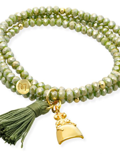 Pulsera de plata de primera ley (925) chapada en oro amarillo de 18kt, con nucleo de silicona elástica y cristal de strass facetado, con charm Menina. Talla media de 17 cm. (51 cm. total)