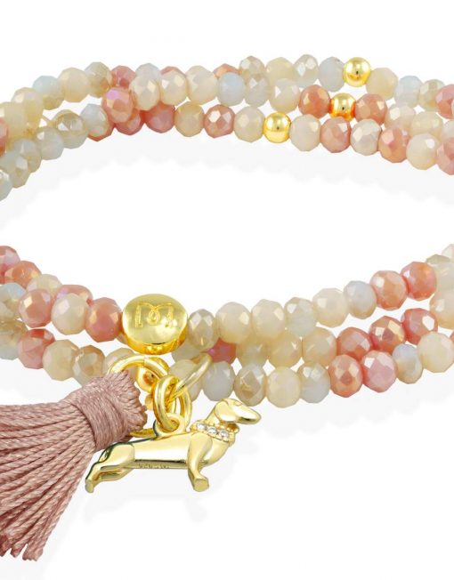 Pulsera de plata de primera ley (925) chapada en oro amarillo de 18kt, con nucleo de silicona elástica y cristal de strass facetado, con charm perro. Talla media de 17 cm. (51 cm. total)