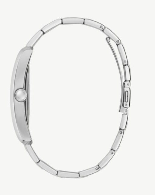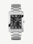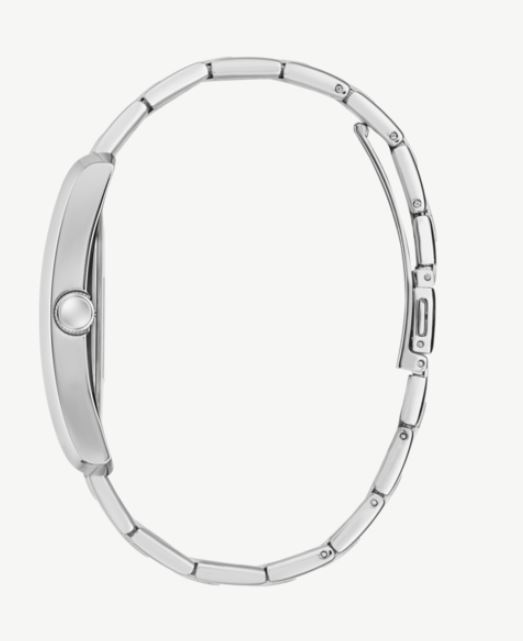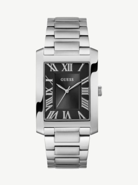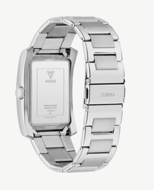 Reloj de hombre Guess con caja de acero reciclado brillante 34mm plateado, esfera de rayos de sol negra con textura exterior, brazalete de acero mate/brillante plateado. Una combinación perfecta de estilo lujoso y sofisticación. El reloj CLYDE presenta un diseño único con una caja rectangular. Con su estética refinada, este reloj emana un estilo elegante que se adapta a quienes buscan distinción en cada detalle.