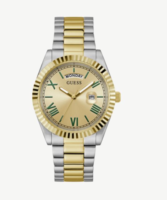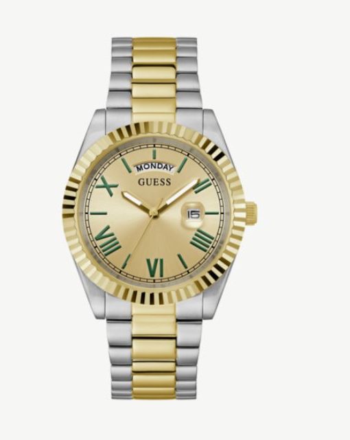 Reloj de hombre Guess con caja de acero reciclado mate 42mm con anillo superior brillante, esfera oro rosa día/fecha de rayos de sol, bisel oro rosa, brazalete de acero reciclado mate/brillante bicolor oro rosa y plateado. Un clásico que nunca pasa de moda. El reloj CONNOISSEUR destaca con su elegante esfera que atrae todas las miradas. Combina estilo y practicidad con un diseño atemporal, mientras su pulsera asegura un ajuste cómodo para el uso diario.