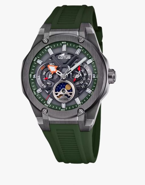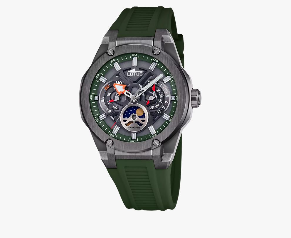 Descubre el poder del diseño con el Lotus Vortex Fase Lunar, un reloj masculino creado para quienes viven con intensidad y buscan destacar en cada momento.Su caja de acero inoxidable y cristal mineral resistente garantizan durabilidad y protección, mientras que la correa de caucho aporta comodidad y un estilo moderno y deportivo.