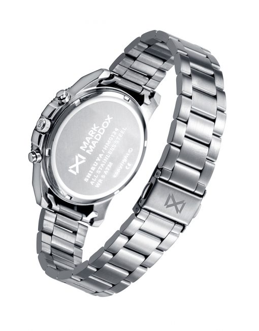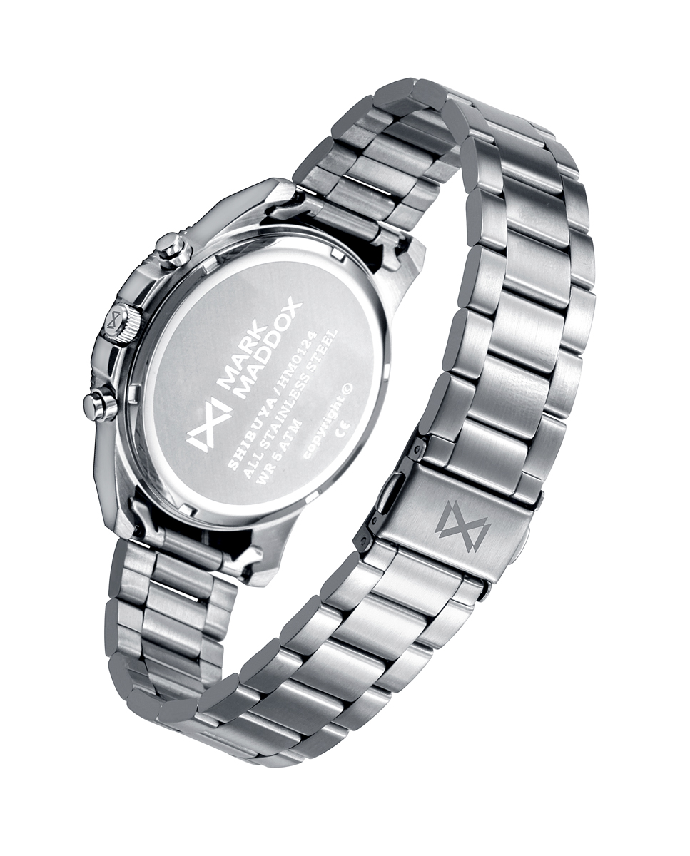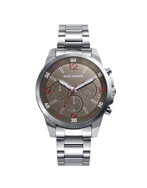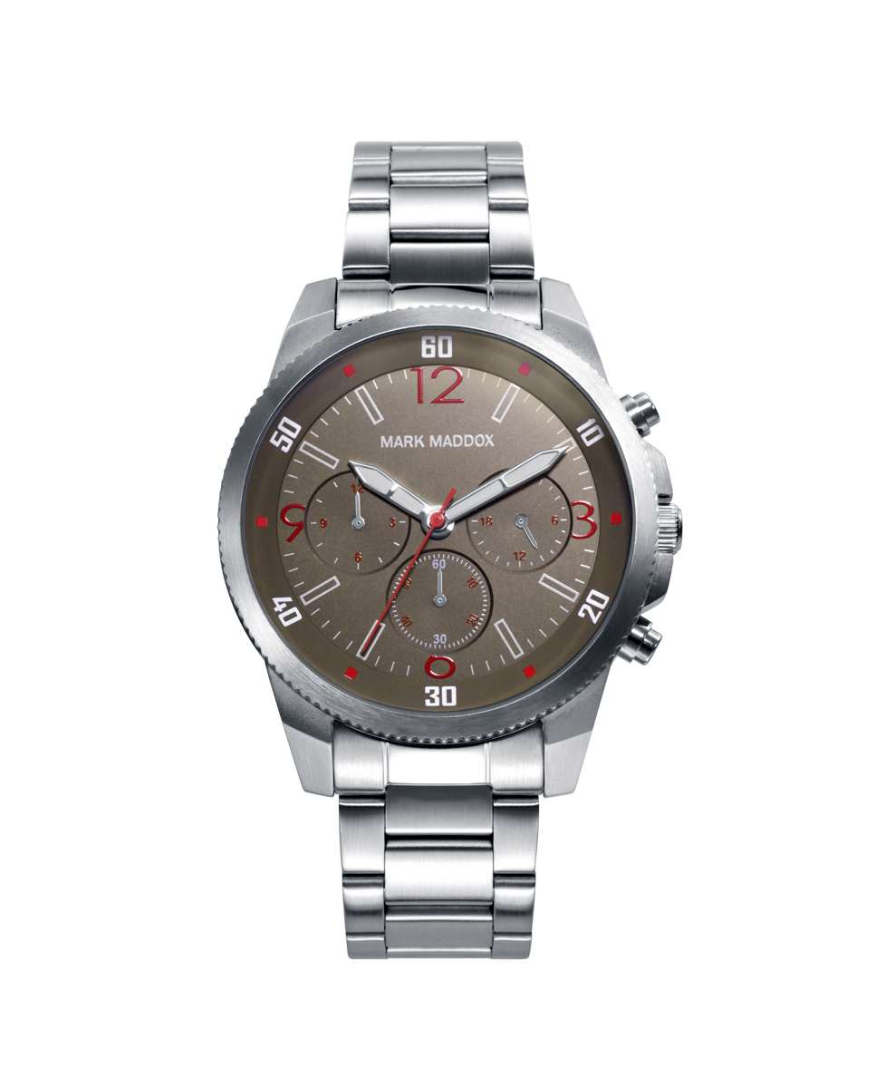 Reloj de Hombre Mark Maddox Shibuya, multifunción ,caja y brazalete en aceo, esfera en color marron, aguja de segundos y números de la esfera 12, 3, 6, 9 en color rojo