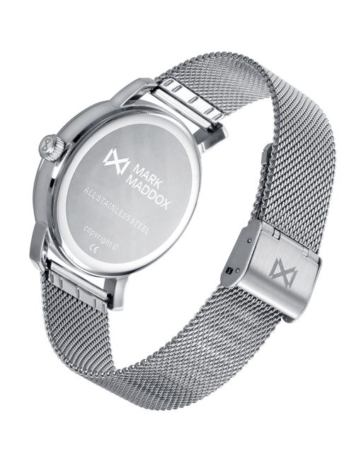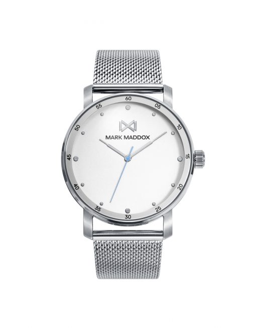 Reloj de Hombre Mark Maddox Midtown,tres agujas , caja y malla milanesa acero en acero, esfera beige con aguja de segundos en azul