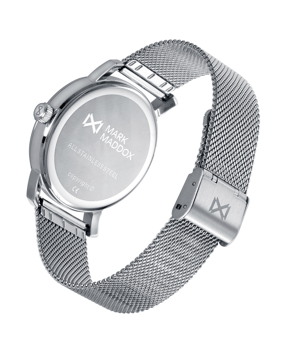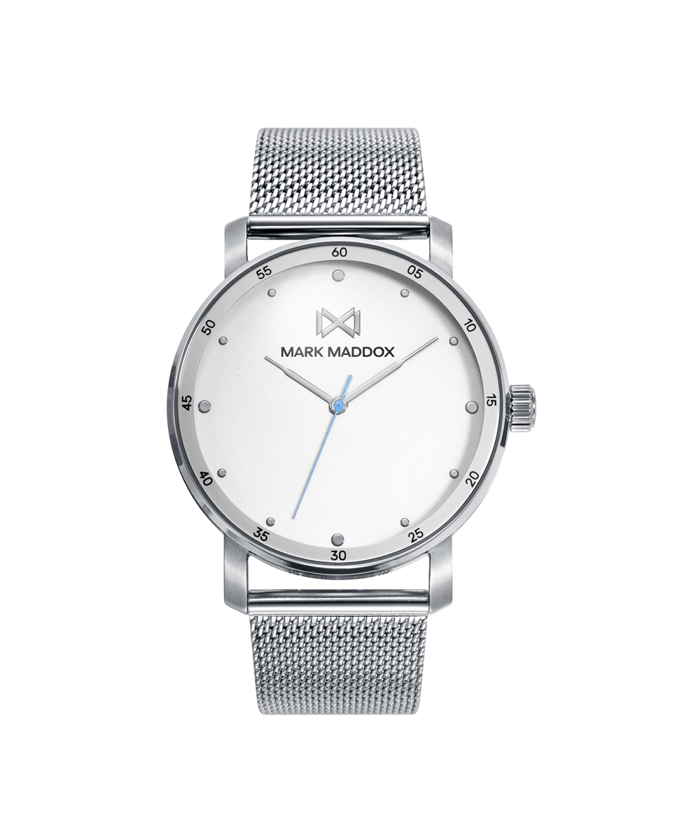 Reloj de Hombre Mark Maddox Midtown,tres agujas , caja y malla milanesa acero en acero, esfera beige con aguja de segundos en azul