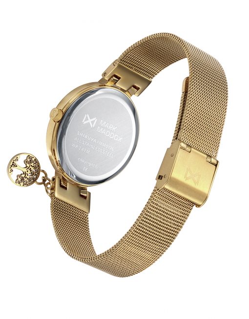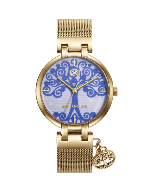 Reloj de Mujer Mark Maddox Shibuya, tres agujas , caja y malla milanesa de acero Ip dorado, esfera bicolor con holograma arbol/luna en color azul.