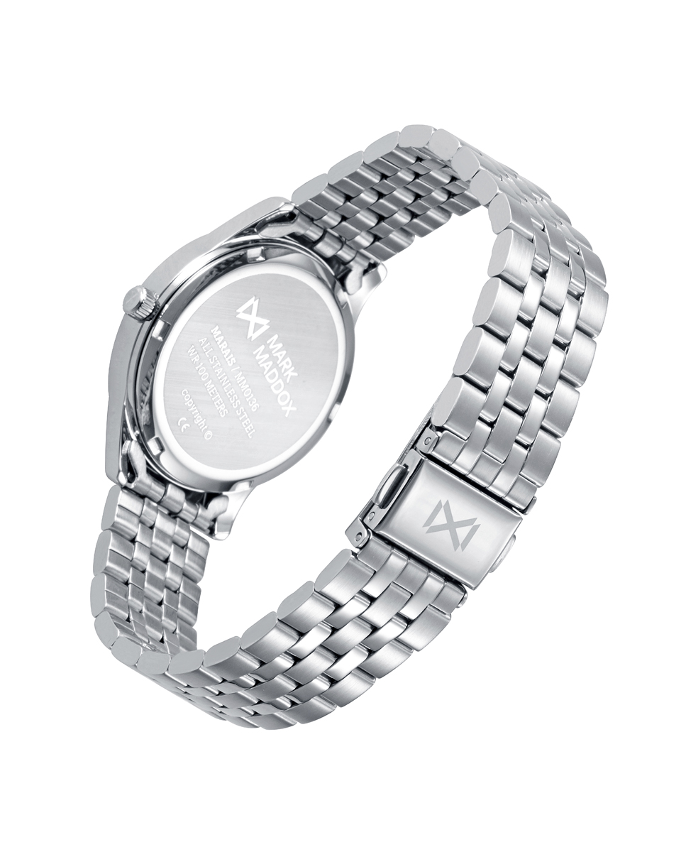 Reloj informal de Mujer Mark Maddox Marais tres agujas, caja y brazalete de acero, esfera azul con indices de acero, aguja de segundo en color amarillo, agujas de horas y minutos en color plata con luminous.