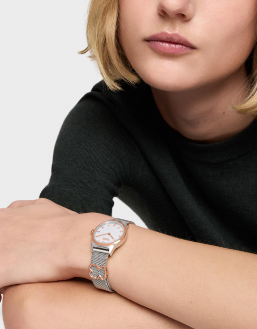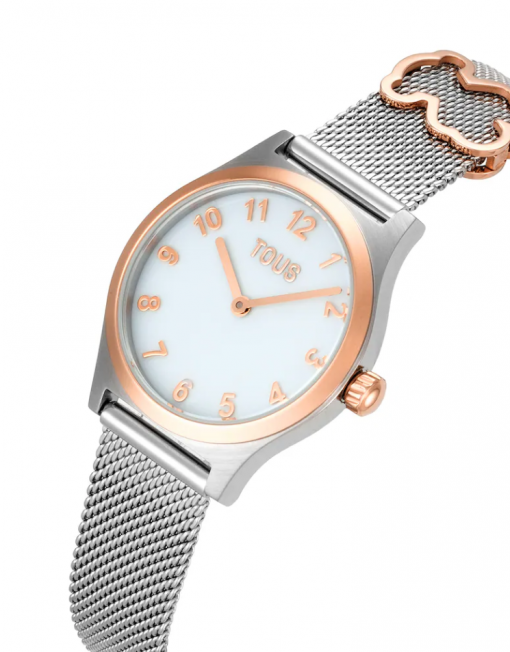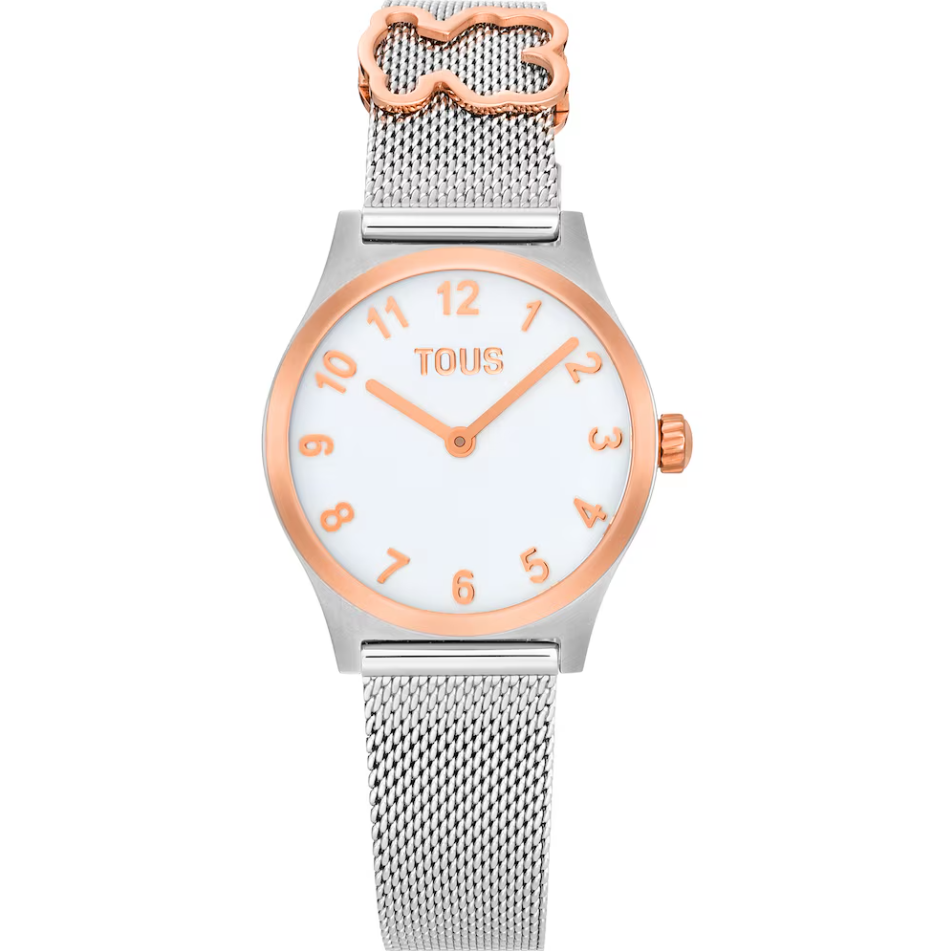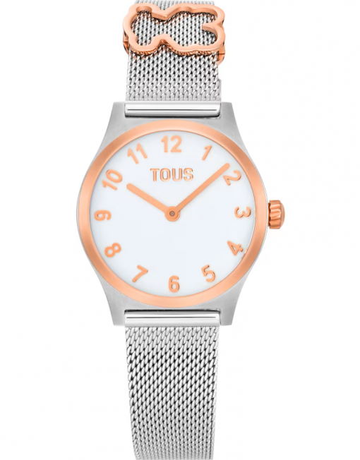 Reloj analógico TOUS EPIC ICON KDT con caja y brazalete en acero inoxidable y acero inoxidable en color oro rosado. Diámetro: 28 mm. Cristal mineral plano redondo. Esfera de metal esmaltada. Fondo de caja a presión. Impermeable a 5 ATM. Movimiento analógico de cuarzo japonés. Batería de óxido de plata SR621SW de 1,55 V / 0,35 gramos. Funciones: hora y minutos. Brazalete con motivo oso en acero rosado. Brazalete medidas 12h: 14 mm x 12 mm x 75 mm / 6h: 14 mm x 12 mm x 110 mm. Cierre de malla milanesa con cierre de seguridad.