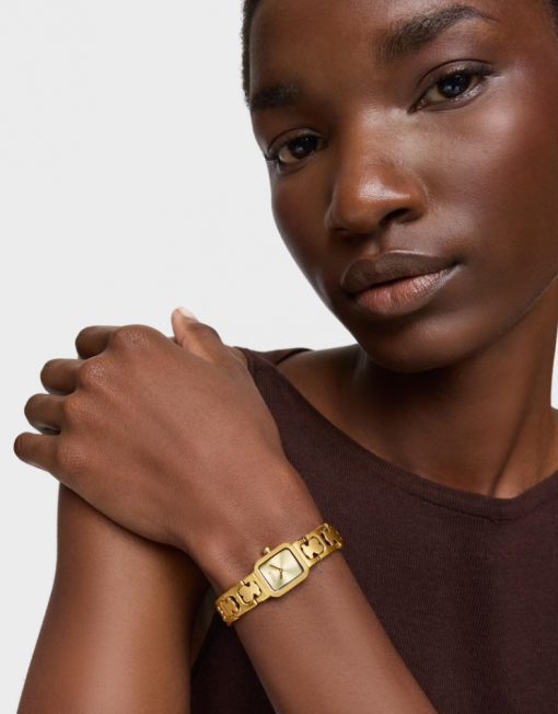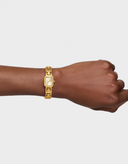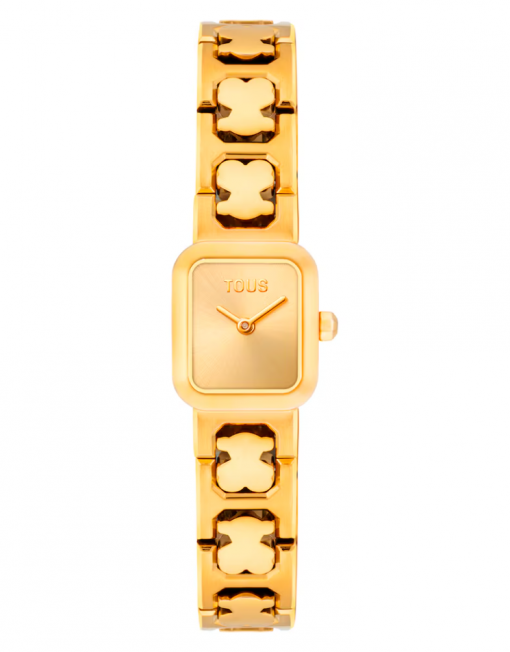 Reloj analógico TOUS Icon Time con brazalete de acero dorado con motivos oso. Dimensiones: 21,7 mm x 16,2 mm. Esfera de metal. Cristal mineral plano octogonal. Funciones: hora y minutos. Impermeable a 3 ATM. Movimiento analógico de cuarzo japonés. Brazalete: 82,8mm x 11,4mm x 11,4mm. Cierre mariposa con pulsadores.