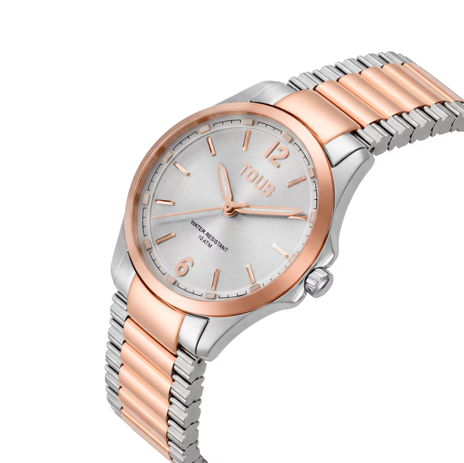 Reloj analógico TOUS DRIVE con caja y brazalete de acero inoxidable y acero inoxidable en color oro rosado. Diámetro: 33,5 mm de diámetro. Esfera metálica de doble capa y cristal mineral plano redondo. Fondo de caja a rosca. Impermeable a 10 ATM. Movimiento analógico de cuarzo japonés. Batería SR626SW de 1,55 V con autonomía de 36 meses. Funciones: hora, minutos y segundos. Brazalete medidas: 18 mm x 18 mm x 82,62 mm / 18 mm x 18 mm x 82,62 mm. Cierre tipo mariposa con pulsadores.