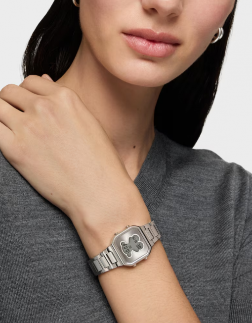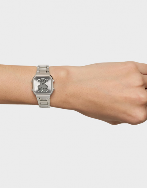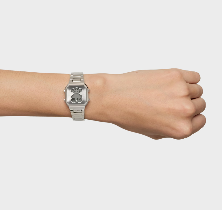 Reloj digital TOUS D-BEAR MINI con caja y brazalete de acero inoxidable. Dimensiones: 27 mm x 34,5 mm. Cristal mineral plano cuadrado. Esfera metálica con pantalla LCD iluminada. Impermeable a 3 ATM. Batería de litio CR1620 de 3 V. Funciones: hora en formato 12/24 h, minutos, segundos, día, mes, día de la semana, cronógrafo de 1/100 s y alarma. Brazalete medidas: 78 mm x 16,6 mm x 14 mm / 70 mm x 16,6 mm x 14 mm. Cierre desplegable con pulsadores.