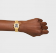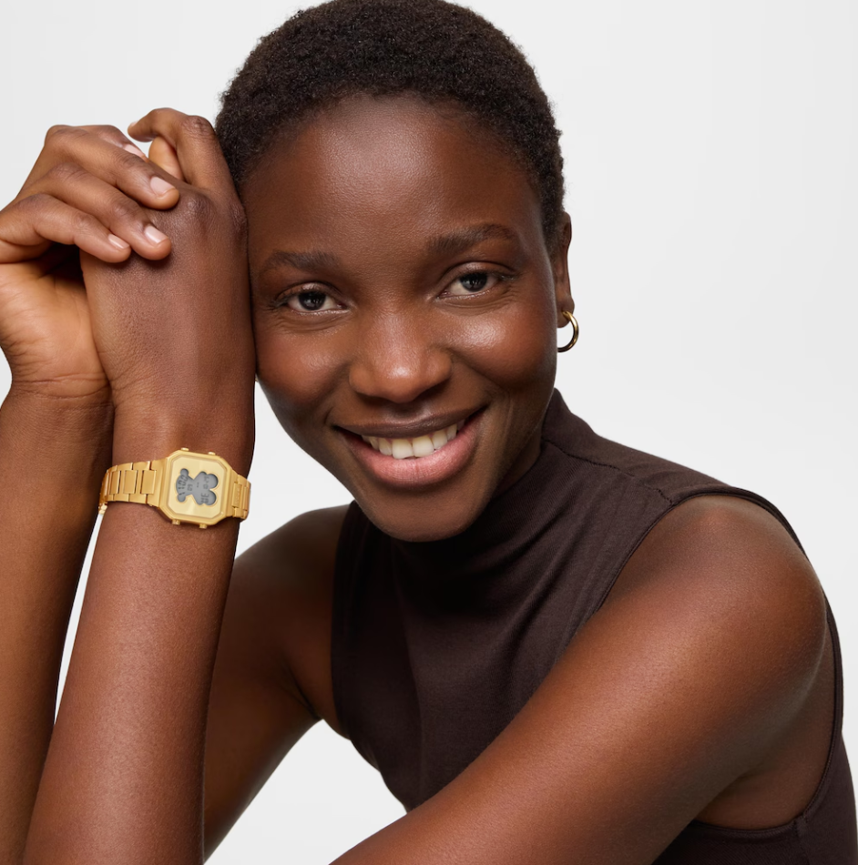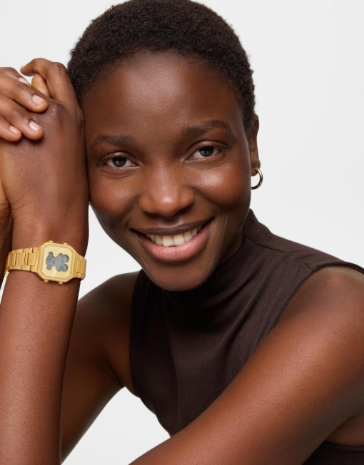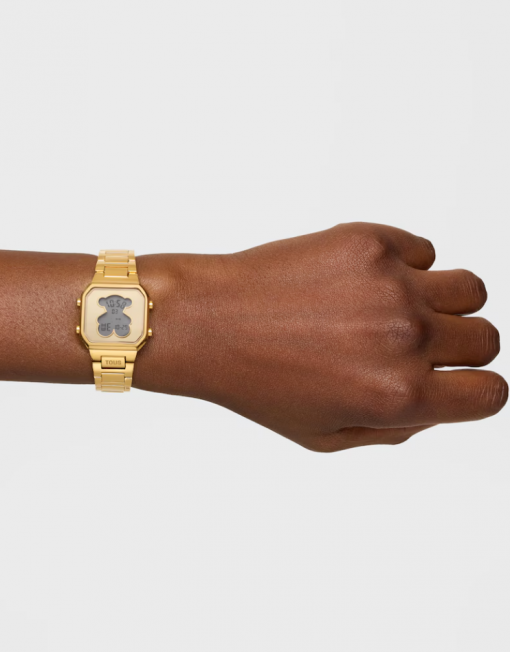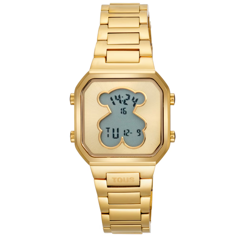 Reloj digital TOUS D-BEAR MINI con caja y brazalete de acero inoxidable en color dorado. Dimensiones: 27 mm x 34,5 mm. Cristal mineral plano cuadrado. Esfera metálica con pantalla LCD iluminada. Impermeable a 3 ATM. Batería de litio CR1620 de 3 V. Funciones: hora en formato 12/24 h, minutos, segundos, día, mes, día de la semana, cronógrafo de 1/100 s y alarma. Brazalete medidas: 78 mm x 16,6 mm x 14 mm / 70 mm x 16,6 mm x 14 mm. Cierre desplegable con pulsadores.