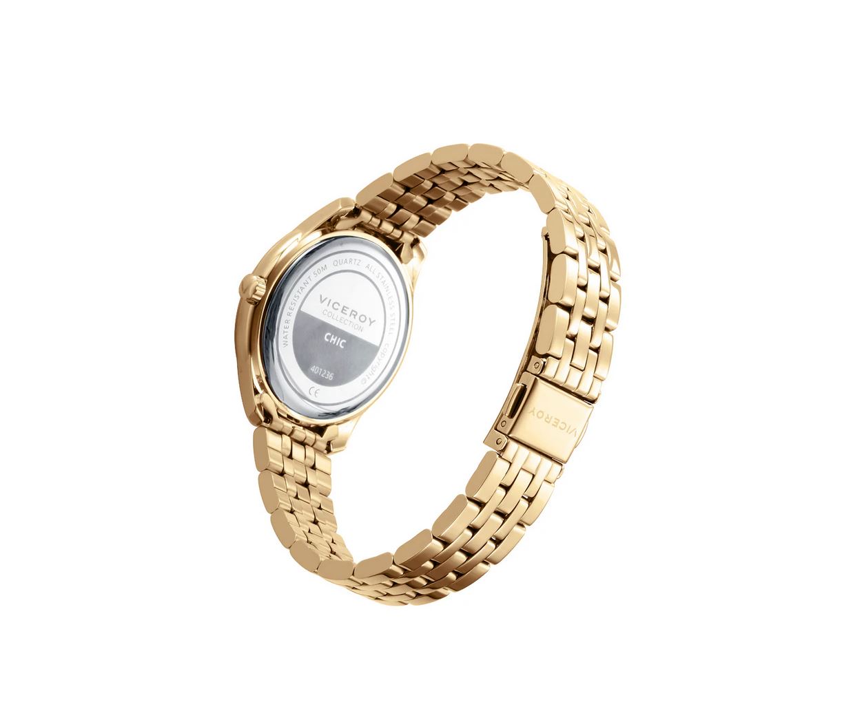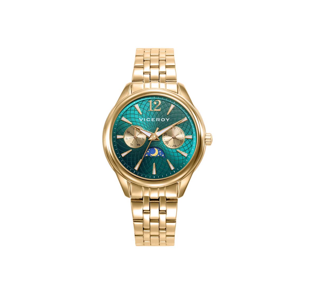 Este reloj de mujer multifunción con fase lunar es una combinación perfecta de lujo y funcionalidad. La caja y el brazalete de acero con IP dorado brindan un estilo sofisticado y elegante. La esfera verde, realzada por índices, agujas horarias y contadoras en color dorado, crea un contraste armonioso y distintivo, que aporta un toque de exclusividad al diseño. El cristal mineral asegura su durabilidad, mientras que las funciones adicionales como la fase lunar lo convierten en un accesorio práctico y elegante, ideal para la mujer que busca un reloj versátil con un diseño impactante.