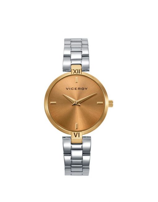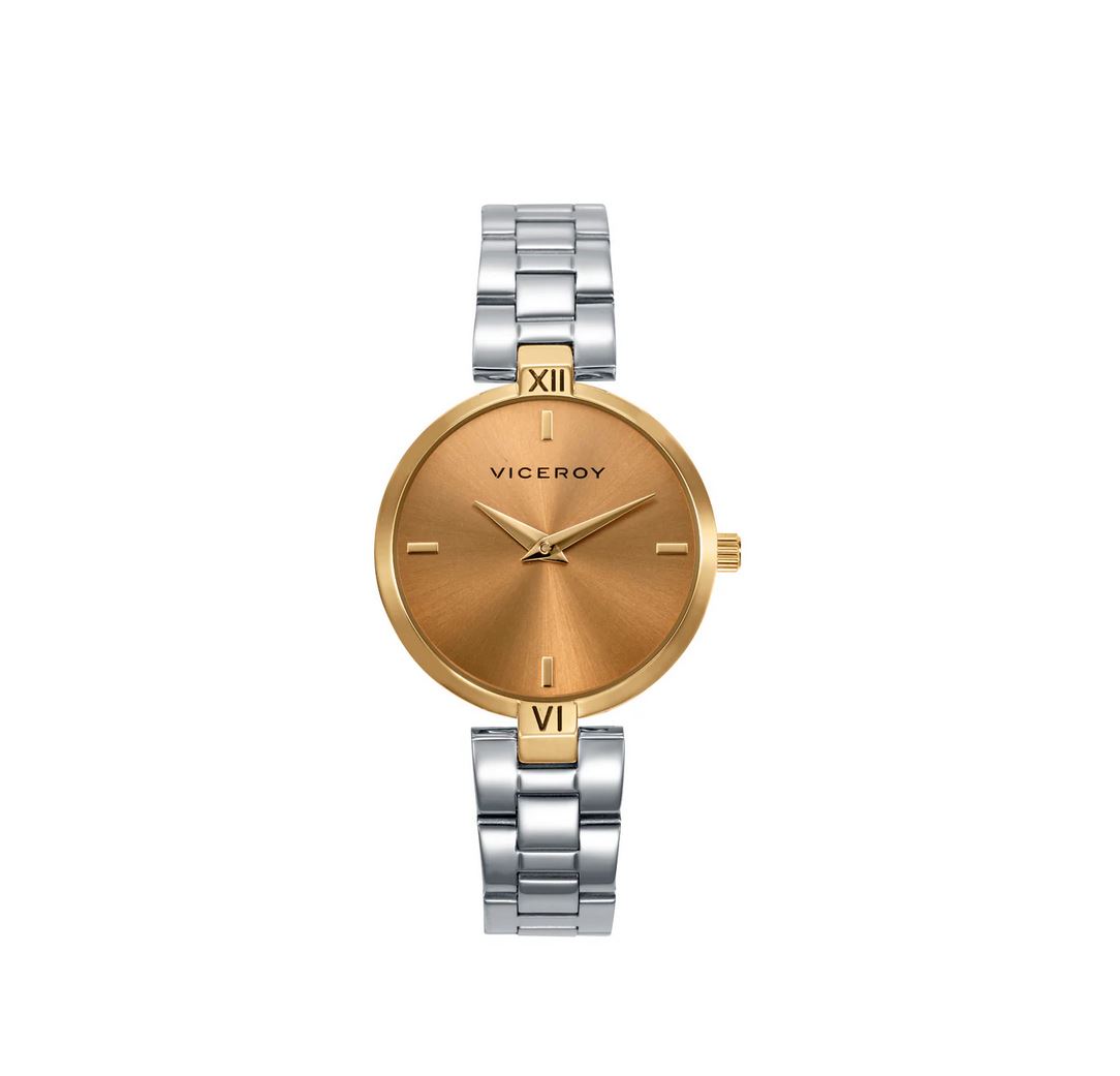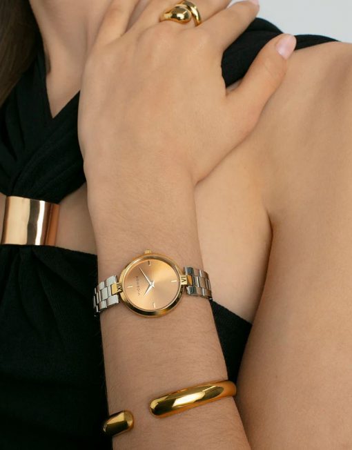 Un toque vibrante y sofisticado: este reloj de mujer con dos agujas destaca por su caja y brazalete de acero IP dorado, que aportan un acabado elegante. Su esfera naranja, combinada con índices y agujas en tono IP dorado, crea un contraste audaz y lleno de personalidad. Con cristal mineral resistente, es el accesorio ideal para quienes buscan añadir color y estilo a su día a día.