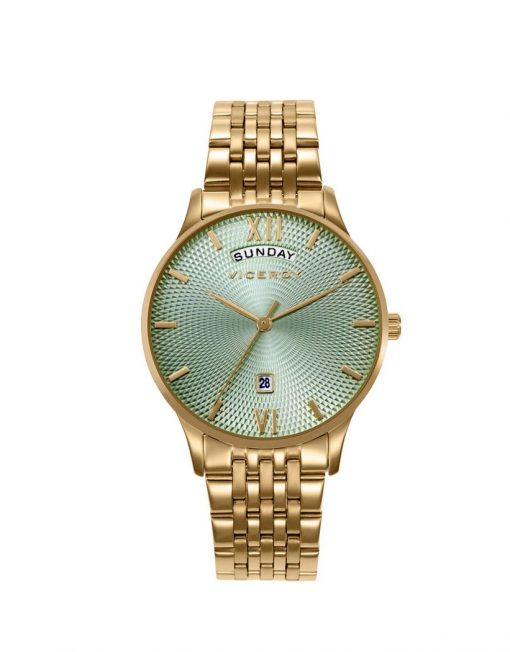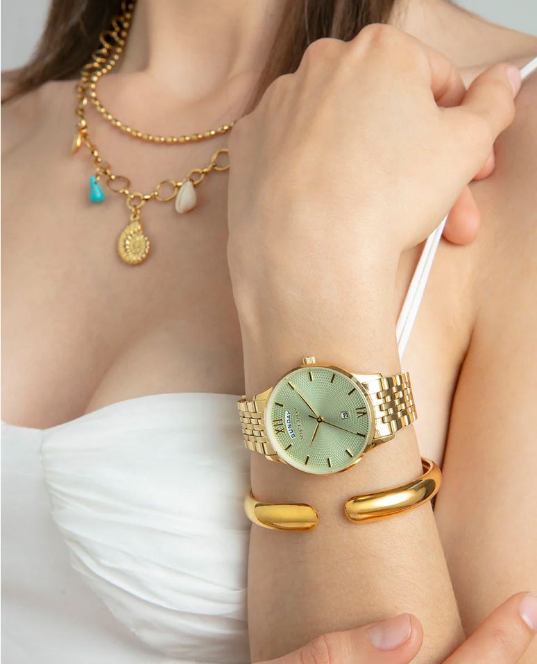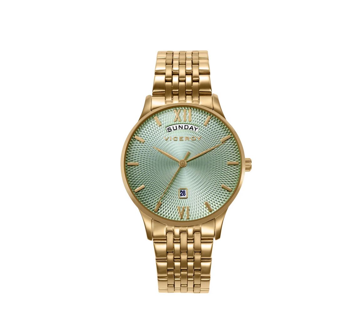 Elegancia dorada con un toque vibrante: este reloj de mujer con tres agujas y calendario combina la sofisticación del acero IP dorado con la frescura de una esfera verde. Los índices y agujas en tono dorado crean un efecto armonioso y distinguido. Su caja resistente al agua hasta 5 ATM y el cristal mineral garantizan durabilidad y protección. Un accesorio ideal para destacar con estilo.