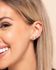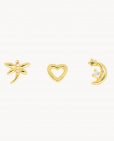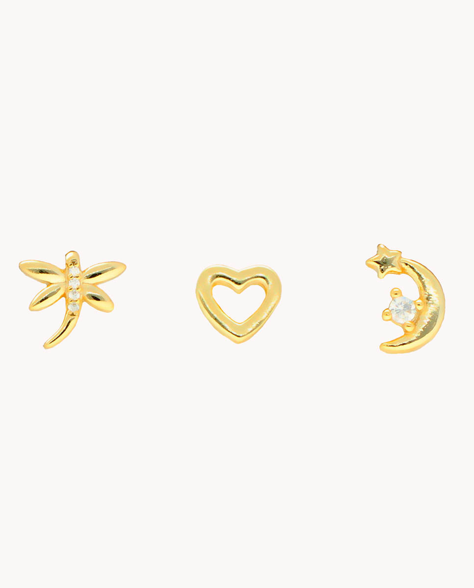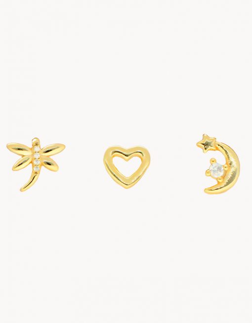 Set de tres pendientes individuales de plata de ley 925 bañados en oro con circonitas blancas y diferentes formas, cierre de presión.