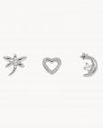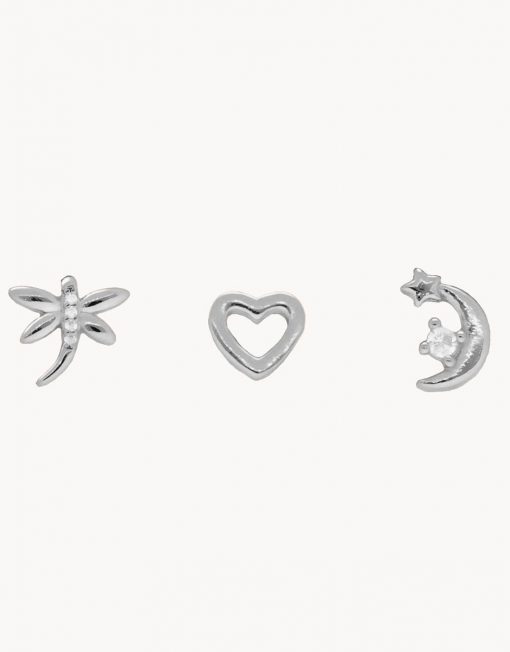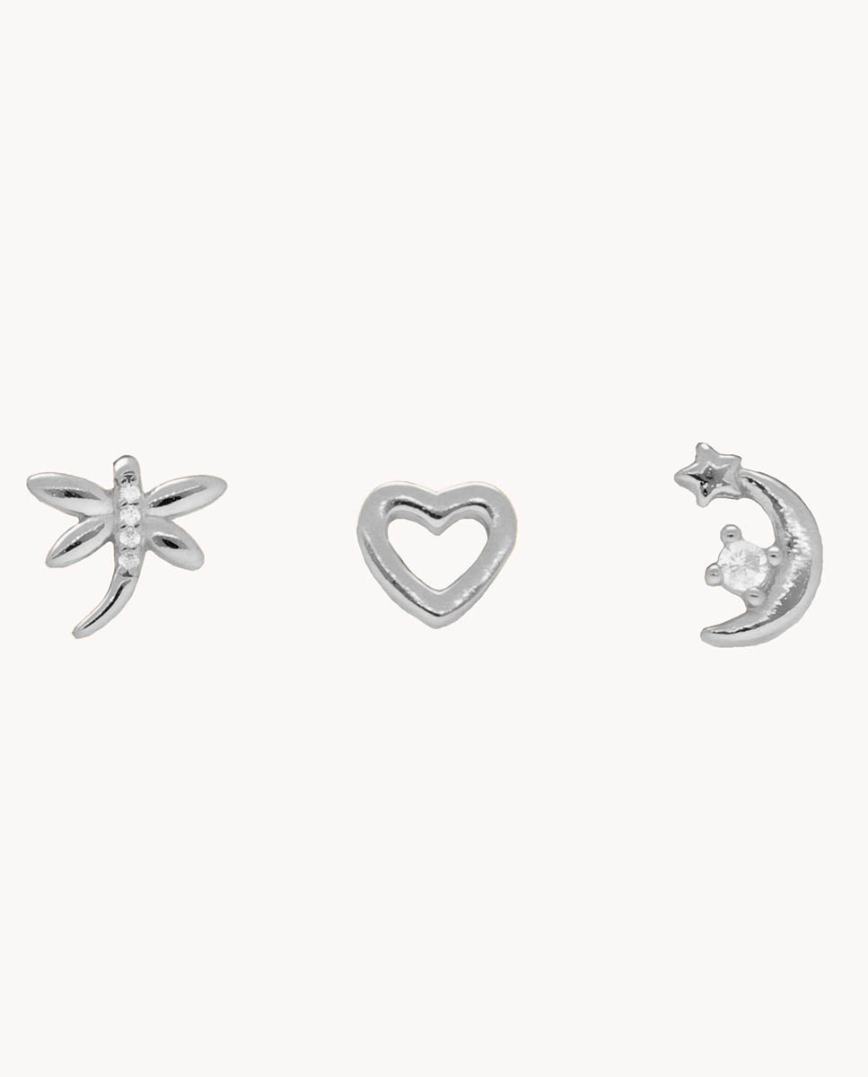 Set de tres pendientes individuales de plata de ley 925 bañados en rodio con circonitas blancas y diferentes formas, cierre de presión.