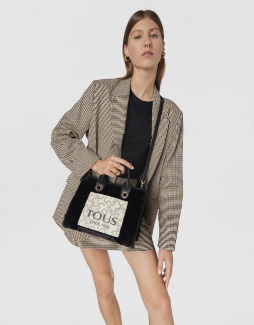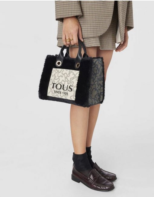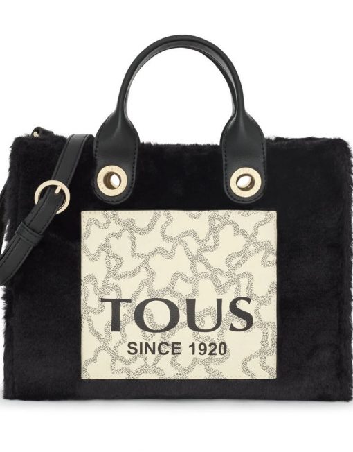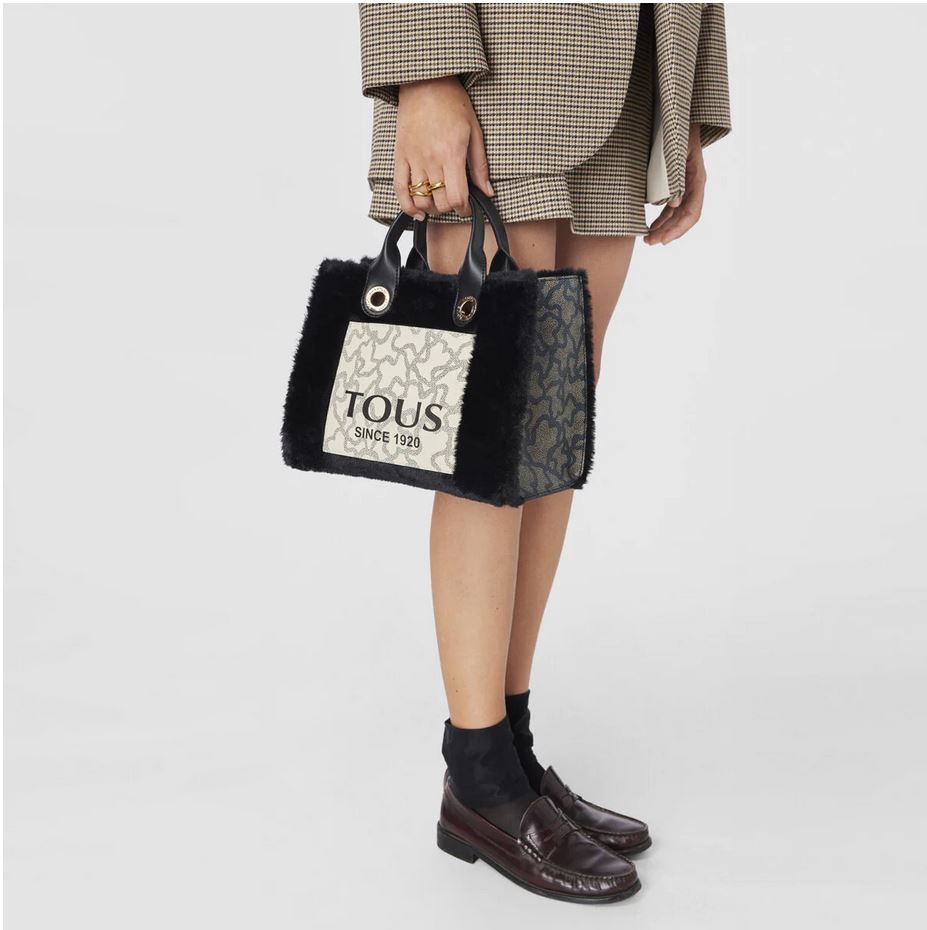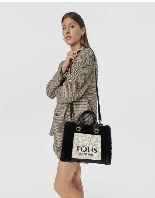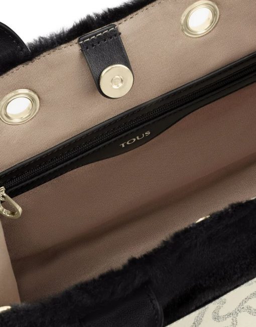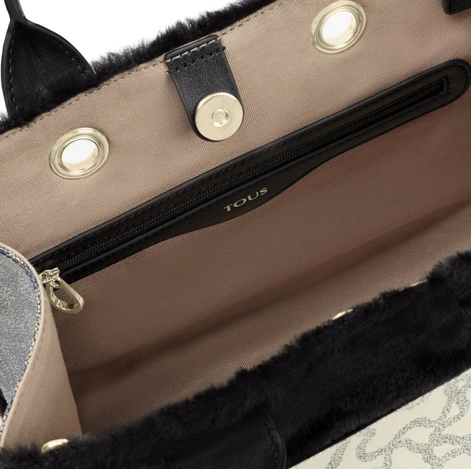 Bolso shopping mediano TOUS de la colección Amaya Kaos Icon de de pelo sintético combinado con lona en color negro. Cierre con botón magnético. Parte interior con dos bolsillos con cierre de cremallera. Parte exterior con un bolsillo delantero abierto. Asa de mano y asa larga con ganchos extraíble y ajustable. Medidas (alto x ancho x fondo): 30 x 27 x 14 cm.