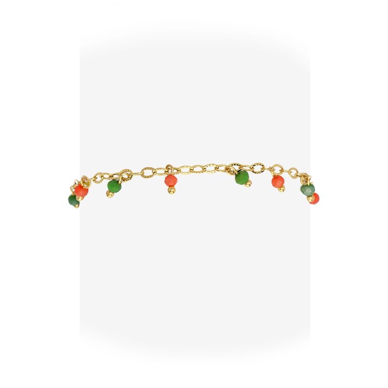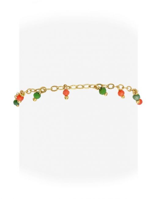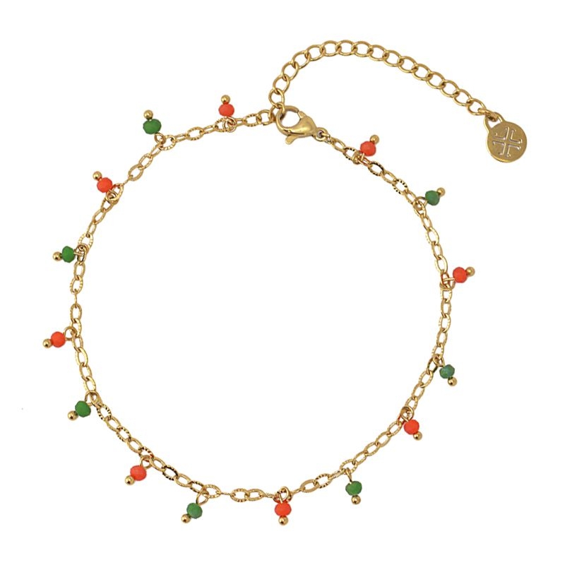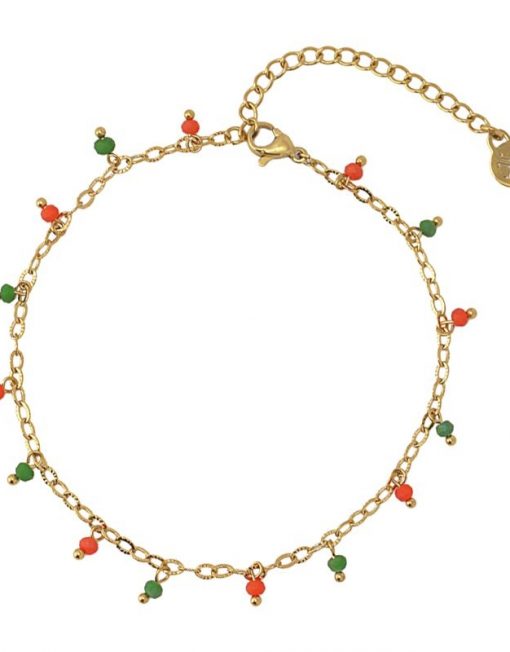 Tobillera de cadena fina de acero quirúrgico bañado en oro y abalorios de cristal multicolor.